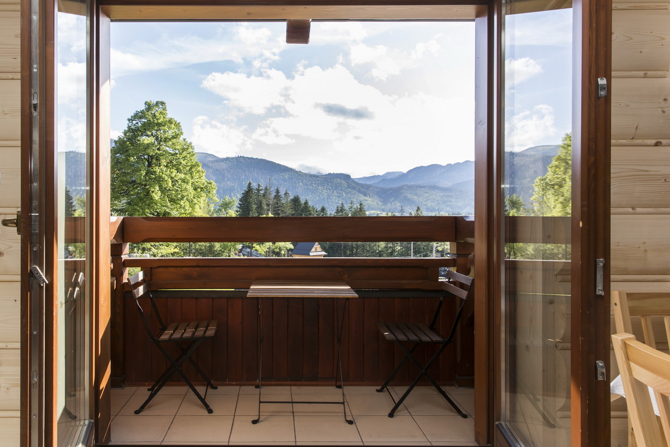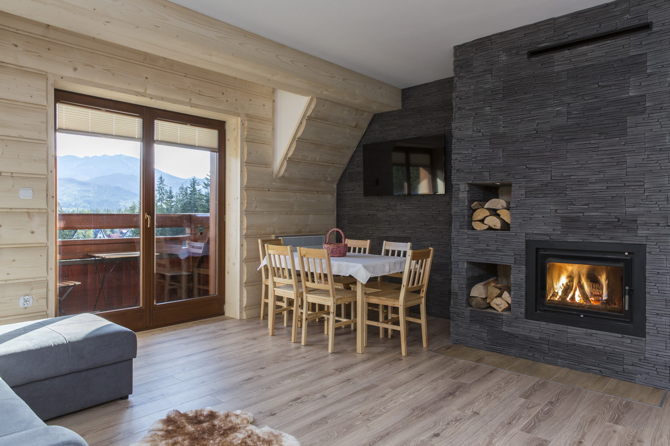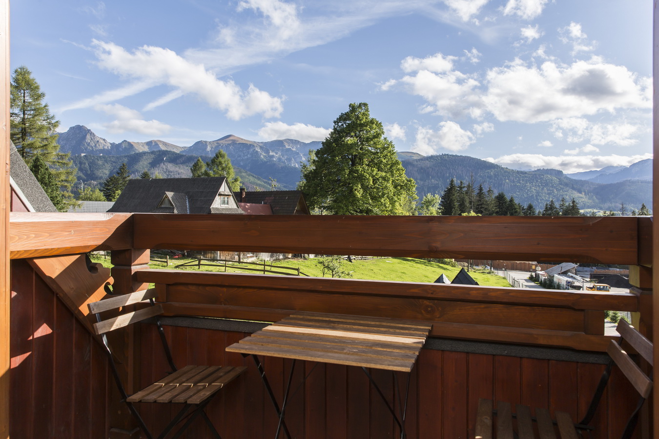 - salonu z rozkładaną dwuosobową sofą , TV Sat, kominka oraz wyjścia na balkon z widokiem na Tatry
