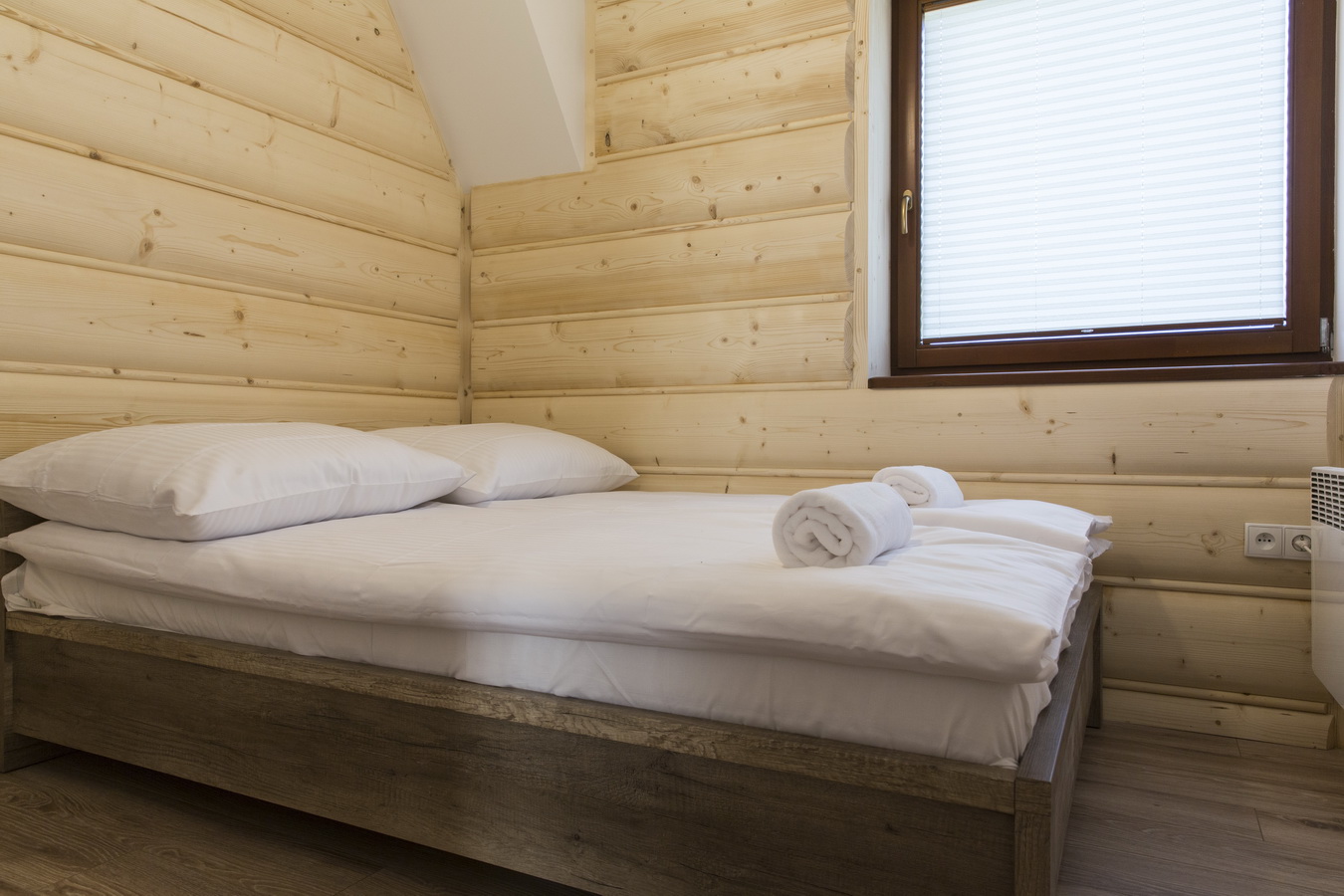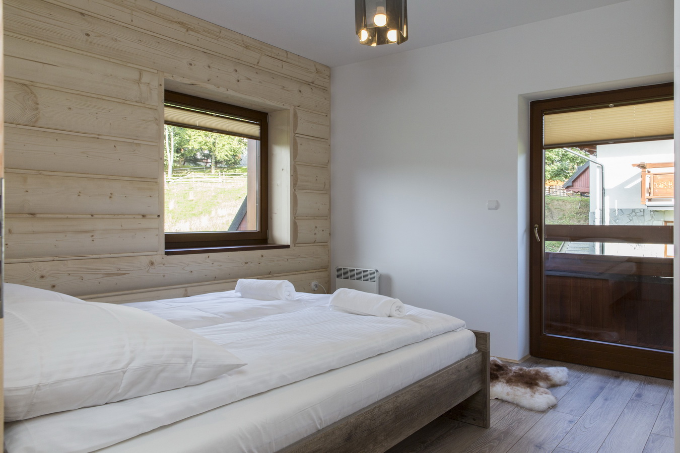 - I zamykanej sypialni z łóżkiem małżeńskim i wyjścia na balkon