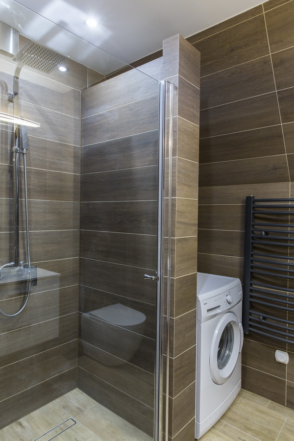 W łazience: pralka, prysznic, ręczniki , suszarka do włosów, umywalka, wc