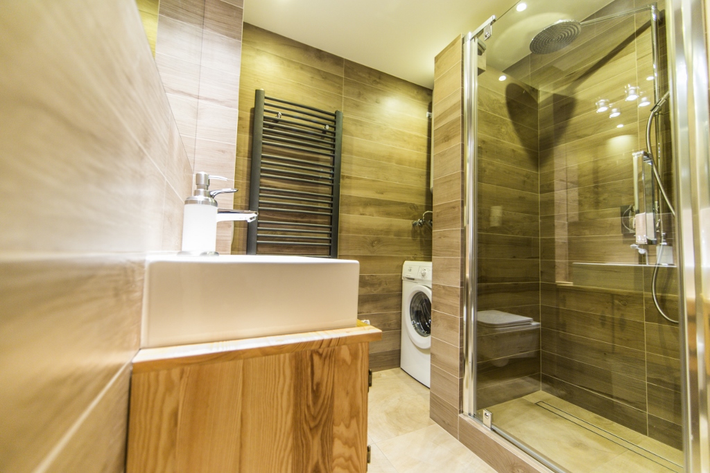W łazience: pralka, prysznic, ręczniki , suszarka do włosów, umywalka, wc