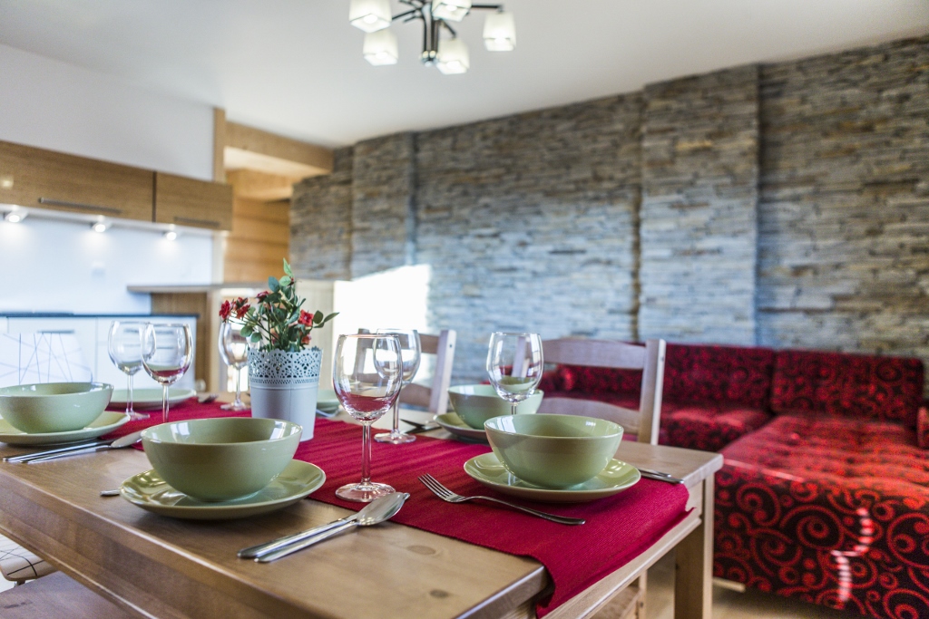 - salonu z rozkładaną dwuosobową kanapą, częścią jadalną oraz TV sat (HBO, CINEMAX, ELEVEN sports)